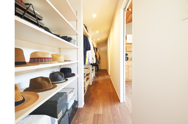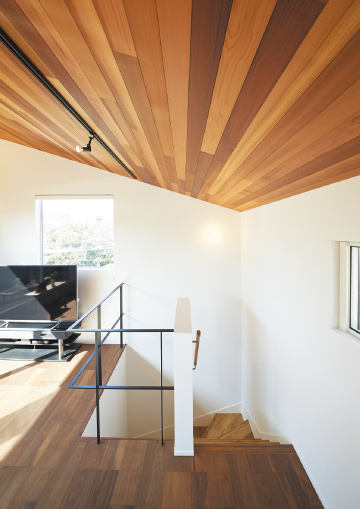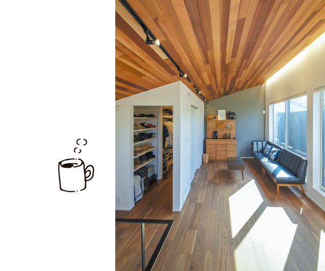 玄関を開けると、土間続きのダイニングキッチンが広がる。あたたかな日差しが差し込む土間では、愛犬が気持ちよさそうに日向ぼっこ。アプローチの景色を楽しみつつ、家族と共に心地よい空間を満喫しています。部屋を細かく仕切らず、ひとつながりにしたプランは、自然と家族が集いやすく、いごこちの良いものに。お施主様の想いとこだわりを叶えた住まいとなりました。