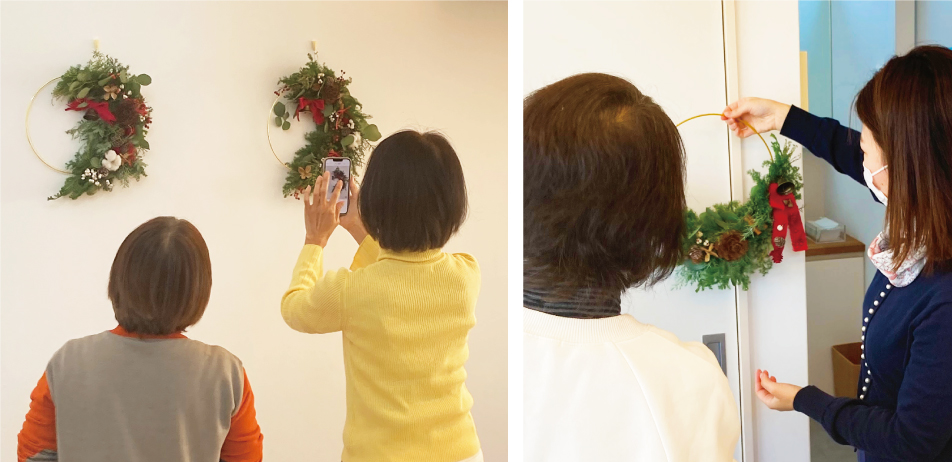 同じ材料を使っているのに、向きや飾り付けの位置などで全く印象の違う可愛いリースが完成しました!!                                                     お一人お一人全く違う仕上がりなので、他の参加者の方の作品を見て楽しめるのもイベントの醍醐味です♪