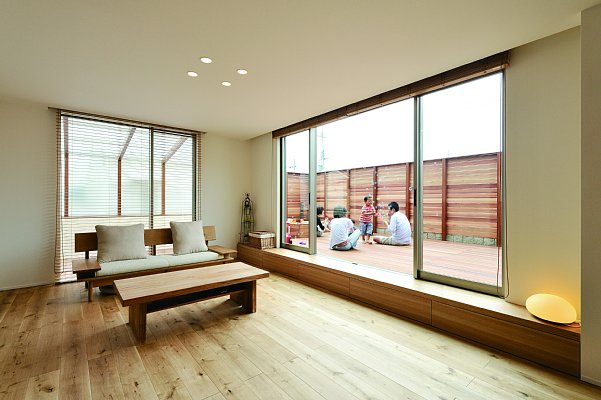 外観・内観ともに、それぞれの空間に適した木材をふんだんに使用して木の質感を活かした温かみのある家に仕上げました。また、通りとの高低差を活かした外構計画と大きく開けた窓により、リビングから庭へとつながる開放感たっぷりの空間がうまれ、外からの視線を気にしなくてもいい、のびのび暮らせる家になりました。