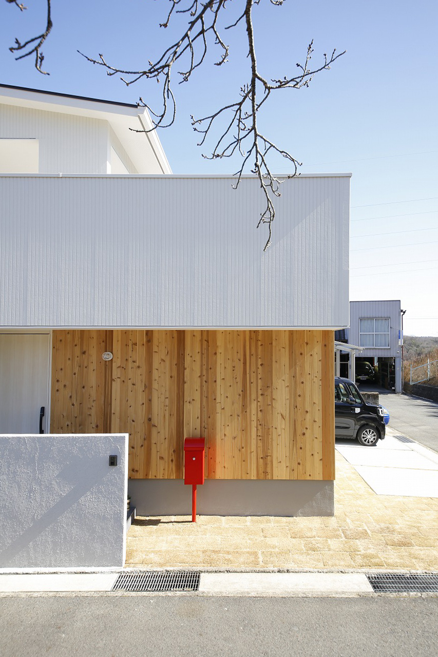外観は自然豊かな風景と青い空に眩く映える白い外壁に、色の濃淡が大きく表情豊かなレッドシダーをあしらい、赤いポストが印象的な素敵な佇まいです。