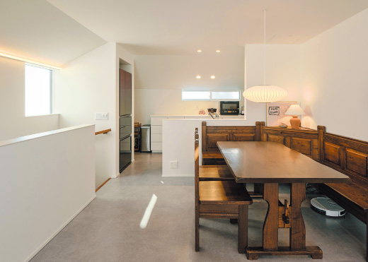 北側斜線制限のため、勾配天井で仕上げたキッチン。圧迫感を感じさせないデザインに。