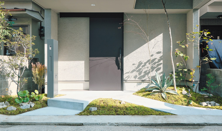 平坦で単調になりがちな外構に、ポストやスロープ、植栽などで高低差をつけることで、上質で豊かな雰囲気に。