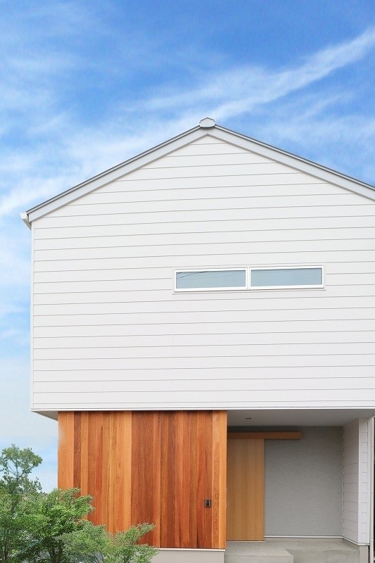 真っ白い外壁と木板の濃淡が美しい、三角屋根の家。